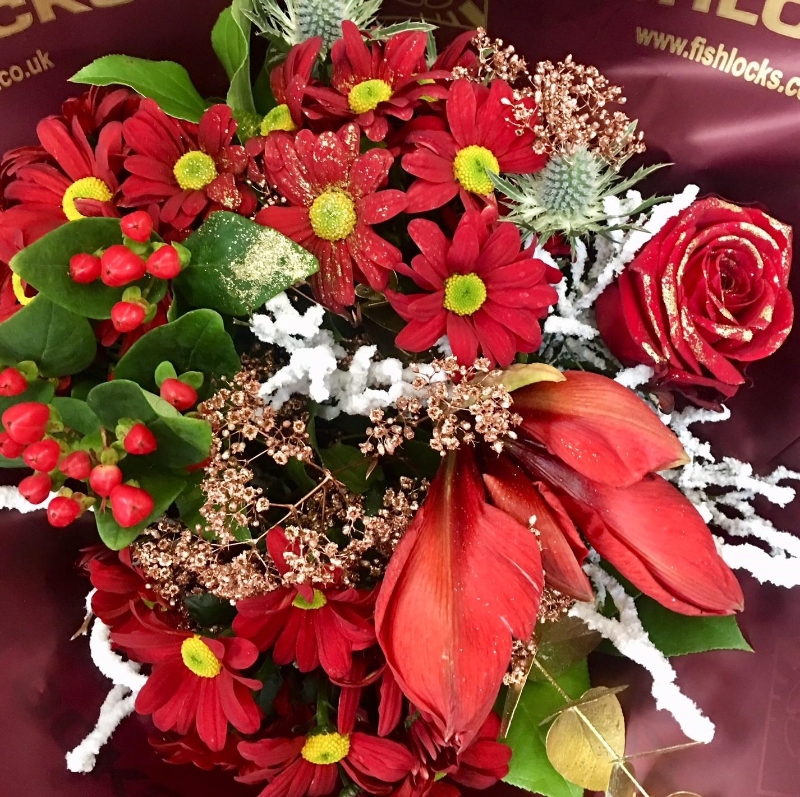 A beautiful Christmas mix of red amaryllis, red naomi roses, red hypericum, red chrysanth, gold eucalyptus, copper gypsophilia, snow covered huckleberry and salal, presented as a stunning Hand tied bouquet.