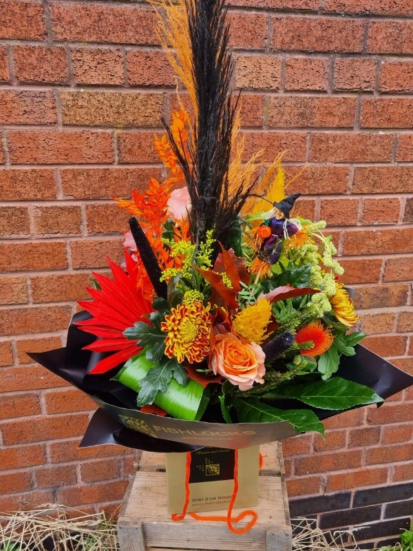 This "Scary" Halloween special arrangement is sure to impress !! Orange & Black Pampas grass, fuego Chrysanth bloom, green amaranthus, yellow celosia, orange & peach  roses, red Oak leaf, Black dipthurus, orange palm and orange  ilex, with solidaster and oistache foliage. Oh yes and a mini Witch in the focal point !! Scarily Perfect !