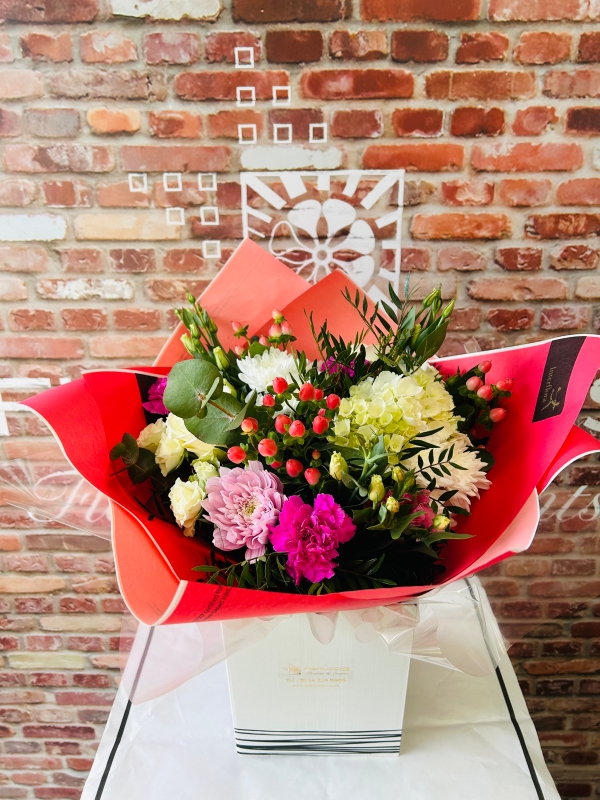 Crafted with love, this stunning arrangement features hydrangea, lilac blooms, cerise carnations, pink lisianthus, pink hypericum, white avalanche rose and white spray rose, all tied together with lush foliage. (available for delivery or collection)
