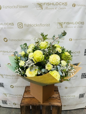 Our Sage Cloud Hand-Tied, a stunning mix of green roses, carnations, white gypsophila, and lush foliage. This elegant arrangement is available in four sizes, making it a perfect choice. This bouquet is a beautiful way to show your love. Order now for UK delivery and make her day truly special.
