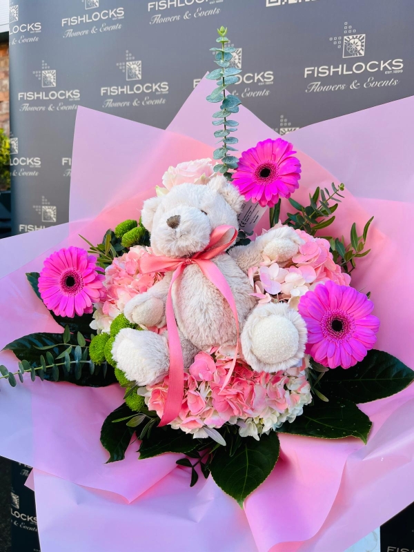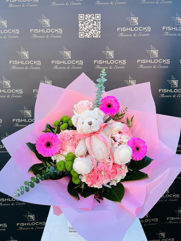Send this beautiful handtied and teddy congratulationing the birth of the new baby girl x