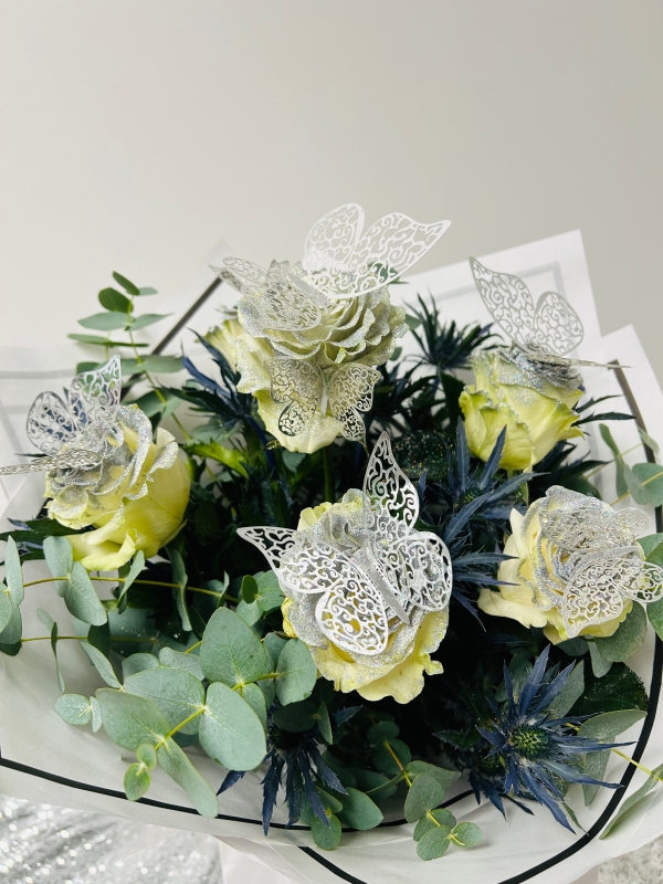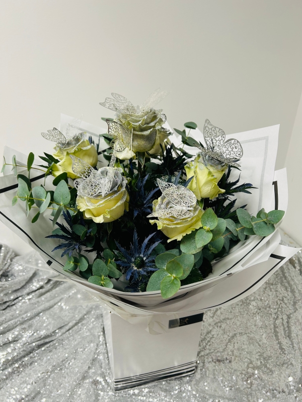 Fishlocks Diamond Dust is a beautiful mix of white mondial roses all hand glittered with a touch of blue euringium, finished off with eucalyptus and adorned with silver butterflies. (available for delivery and collection)