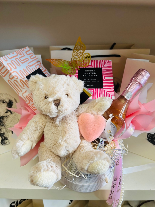 Fishocks Full Of Love Bear Gift Set, comes with a cuddly recycled Rosie bear and a 200ml bottle of La Gioiosa Rose Prosecco and a box of our classic chocolate collection and a box of our extra special cocoa dusted truffles. Presented in a perfectly packaged hatbox. (available for delivery and collection)