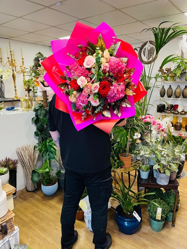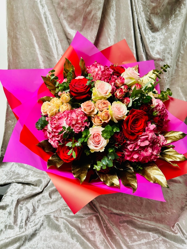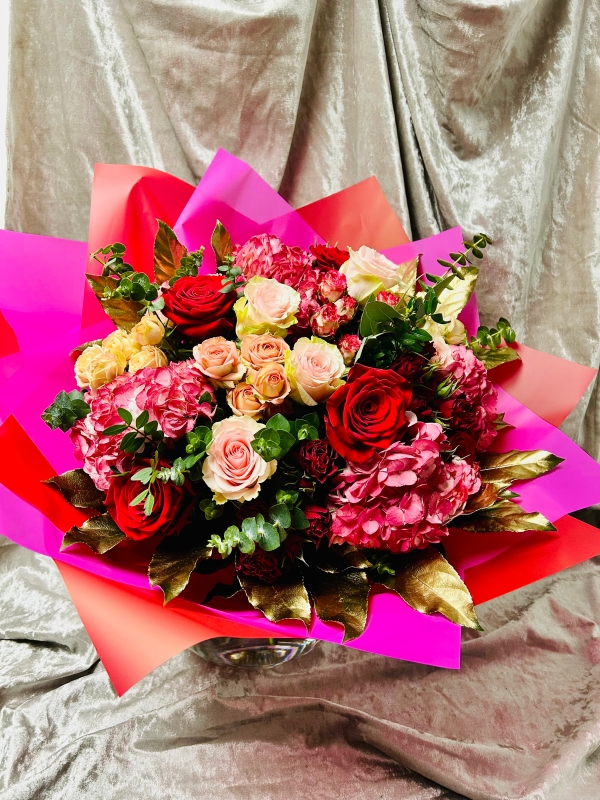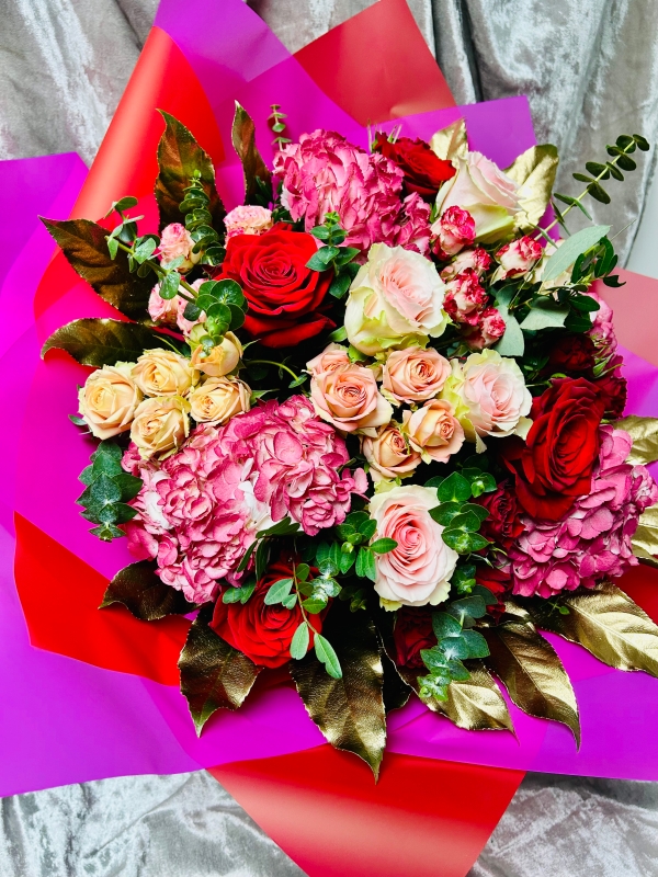 Fishlocks Without You. Give the gift of this showstopper this valentines season. Comprised of Red Roses, Pink Roses, Pink Spray Rose, Red Spray Rose, Peach Spray Rose, Pink Hydrangea, Euycalyptus and finished off with Gold Aralia. Guaranteed wow factor. (available for delivery and collection)