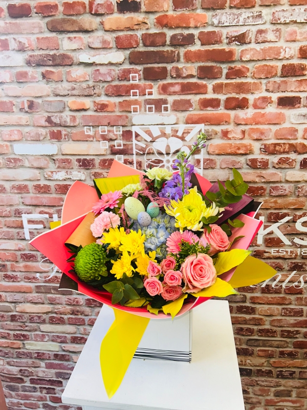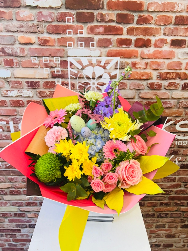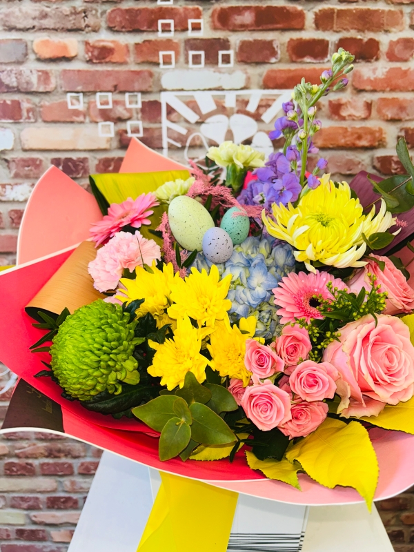 Fishlocks Easter Egg, Give the gift of this cracking beauty of a bouquet this Easter season. Comprised of a stunning mixed colour pallet, vibrant yellows, soft pinks, deep greens and soft blues & lilacs. All finished off with hand painted pastel foliages and topped off with our cute miniature Easter eggs. (available for delivery and collection. Please note the miniature eggs are for display only)