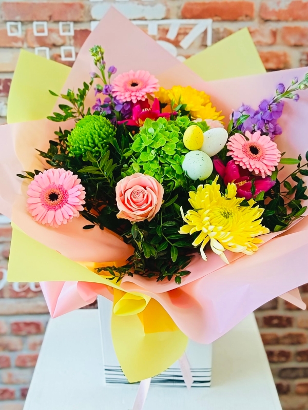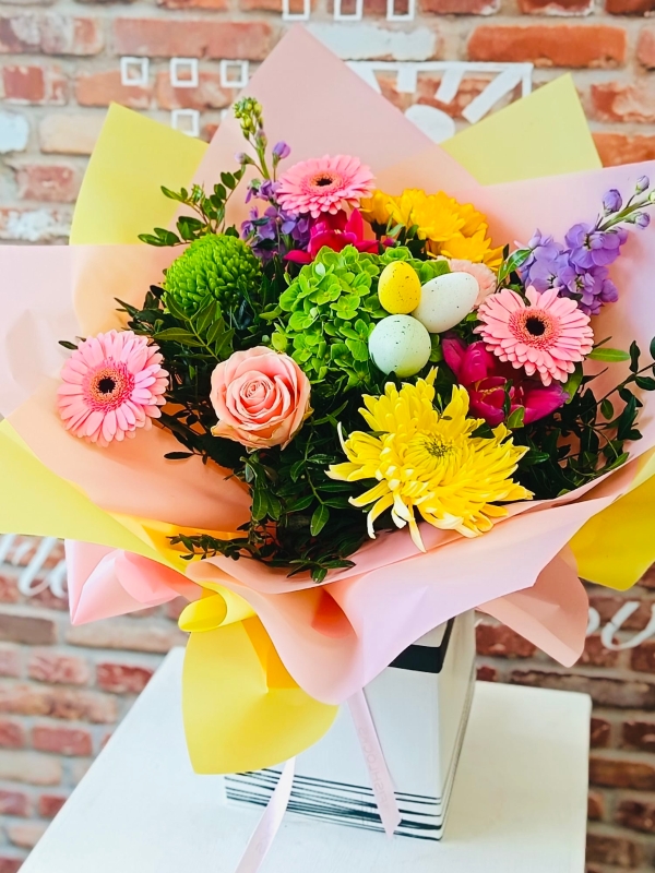 Fishlocks Egg Hunt, This Easter why not hunt those eggs down and gift this zesty bouquet. Comprised of Lush green blooms, deep pinks, zesty yellows and striking lilacs, topped with our miniature Easter eggs.... YOU FOUND THE EGGS! now sit back and enjoy. (available for delivery and collection. Please not miniature eggs are for display only)